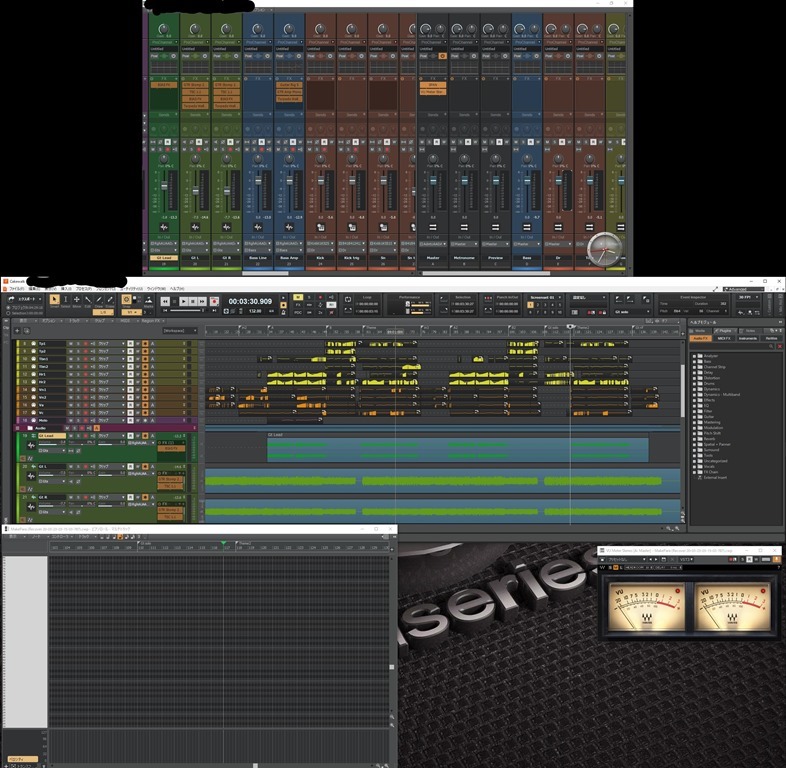 このプロジェクトで打ち込み&ギターやベースの音作りを済ませた後に、ソフト音源含む全てをパラデータで書き出し→ミックスを別プロジェクトで行うという流れでやっています。