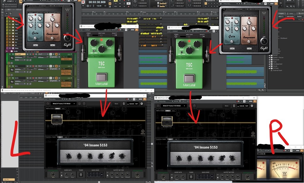 使っているプラグインは、「Waves GTR Stomp2(ゲートとコンプレッサー)」→「TSC1.1(TS-808のモデリング)」→「Bias FX(Peavey 5150モデルでキャビをバイパス)」→WoSとなっています。