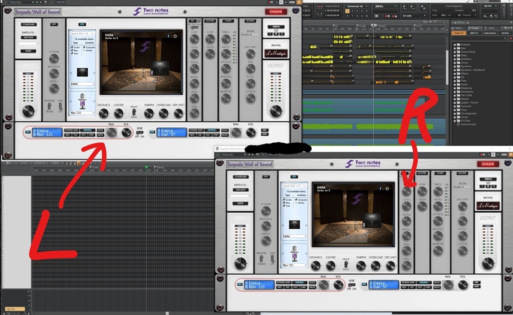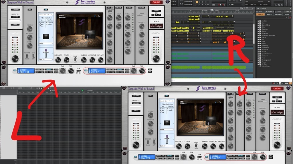 ダブリング収録時の音量・音質の差で多少セッティングが変わっていますが、LとRどちらも同じ方向性で音作りしています。