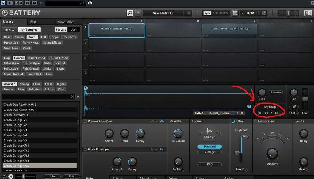 Studio Drummerはセンターとハーフ、オープンリムがD1,D♯1,E1に振り分けられているので、Key RangeをD1~E1の範囲に設定しています。