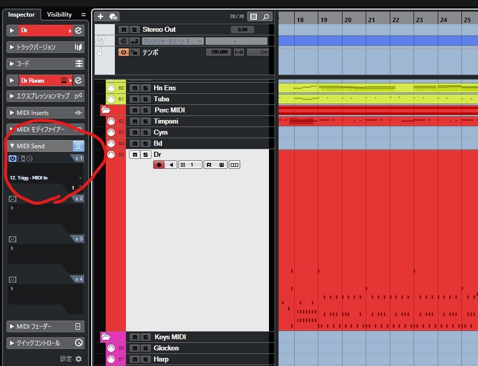 Cubaseの場合は、MIDIセンドを使えますので活用しましょう。インスペクターから設定できます。