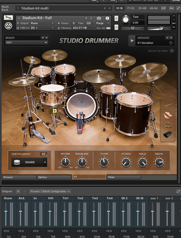 今回はNative InstrumentsのKOMPLETEに収録されている「Studio Drummer」のStadium Kitを利用しています。Pearlのキットが収録されたものです。